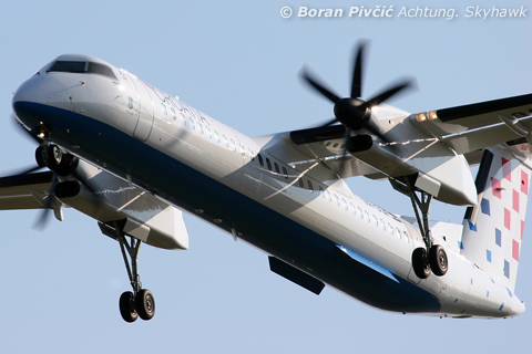 Whopee, a Dash... (irony + sarcasm) 😀 Part of a steady stream of Dash 8s and A320s, Croatia Airlines' newest Dash 8 - the aforementioned 9A-CQF - might have gone unnoticed had I not checked the reg after taking the shot. Its unusual "Croatia 7F" callsign could indicate that this was either a training or shakedown flight (normally, callsigns are the same as the flight number, which is made up of three digits if the flight is scheduled, or four if it's a charter - which is standard practice at carriers around the world. However, to avoid confusion between similar callsigns, or denote special flights, these can be modified into various alphanumeric forms)Our own Lučko resident, 9A-DZD was one of the just three GA movements in the three hours we were thereSomebody wash me! Looking a bit worn out, the Faculty of Transport Sciences Seminole trainer was out bashing the circuit for an hour or so. If all goes well, that should be me up there in a couple of months 🙂An unidentified Croatia Airlines Dash 8 (could be 9A-CQC) just crossing the middle marker, while high above an Emirates 777 zips to the Middle East. As is always the case, the upper flight levels are more interesting than the Zagreb approach, with heavies of all sorts a regular occurence (on some days you can see an Emirates A380 followed a bit later by two company 777s in trail 🙂 )The only genuinely interesting movement of the day - and that says much about our expectations 😀 - was another very handsome Budapest Aircraft Service EMB-120 Brasilia on the daily flight from Budapest. A very rare - and very welcome - aircraft in this part of Europe... (and Europe in general)A splash of colour on approach. Anybody see a pattern with my previous post? Dash 8, EMB-120, Wizz A320... 🙂Finally got N50DD in flight! 😀 The country's only Cessna P210N Centurion (and one of only three Centurions of any mark), N50DD is - despite the reg - permanently based at either Pleso or Lučko, depending on the weather. This is the first time in quite awhile that I've seen it in flight. Not the characteristic Cessna piston single rearward-retracting main gear and the strutless wing (in the Cessna singles lineup seen only on the 177 and 210)And finally an increasingly rare Fokker 70, operated by Austrian Airlines. Note the type's powerful clamshell airbrakes, first seen on the Fokker F-28 Fellowship from which the 70 was developed. These, coupled with very powerful wheel brakes and thrust reversers, mean the 70 (and the bigger 100) can stop in ridiculously short distances for an airliner - another throwback to the F-28's incredible STOL performance. This same airbrake concept would find its way onto the Avro/BAe 146 regional quad 20 years later