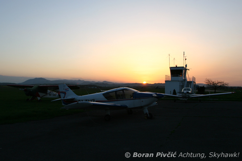 With the sky eerily devoid of contrails and the comm frequencies populated by nothing more than static and random noise, I thought I’d at least make some light of the current unenviable situation and head out to Lučko for some spotting, expecting a more spectacular sunset that usual. The surface front of the ash cloud had caught up with us in the morning, having forced a preemptive closure of the country’s northern airspace at 2 AM local (midnight UTC). Interestingly the airspace was closed for all flights, VFR and IFR, in contrast with Western and Middle European airspace where a “zero flow rate” was imposed – that is, no IFR flight flow was permitted (or more specifically, no IFR clearances would be given), leaving VFR flights to operate at their own risk. Forced to dump the idea of taking a short hop above the field – for the dubious honor of being the only aircraft flying in this part of the country 😀 – I took the camera and went to see what had Eyjafjallajökull thrown at us…