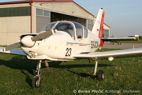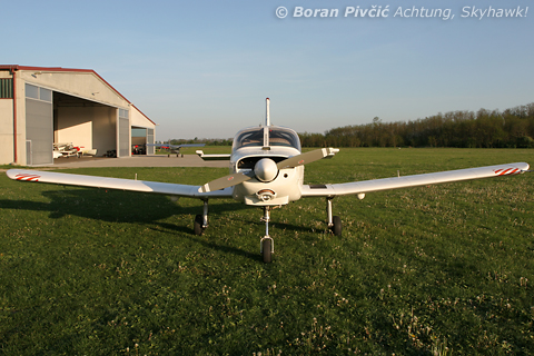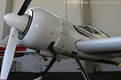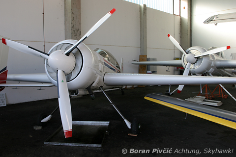To kick off, some Russian radial power! 🙂 Looking remarkably alike at a first glance, these two very different aircraft demonstrate that old adage, "same problems, same solutions". Up front is a relatively common Sukhoi Su-29 two-seater, registered RA-3423K; but out back is a juicy rarity, the single-seat mid-wing Technoavia SP-55 RA-3221K, a modified Yakovlev Yak-55M produced under license. Differing from the 55M in composite control surfaces and somewhat lower weight, the SP-55 is one of the preciously few Yak designs still being producedLike virtually all Soviet/Russian aerobatic designs, the Su-29 is powered by the indestructible Vedeneyev M-14 9 cylinder radial, one of the world's great GA engines. Along with its modified high-power derivative, the M-9, this is the only radial still being produced on a significant scale and is available with anything from 360 to 480 HP - not bad for a design from 1933! 😀Up close and personal with an ex-Yu UTVA-66, S5-DCO. Comparable to the Cessna 180 in size and purpose, the STOL-capable 66 is a rare sight today, with only a handful still flying. But the type's characteristic utilitarian, no-nonsense looks make it noticeable wherever it goes 🙂Like many ex-Yu aircraft, the 66 made use of the uncommon 270 HP six cylinder Lycoming O-480 - a noisy, but I'm told pretty tough and durable packageEasily the most famous and successful light piston from former Yugoslavia is the UTVA-75, a large - but very durable - two-seater powered by a 180 HP Lycoming IO-360 flat four. Once a stalwart of virtually civil and military all flight training, they are fast becoming a common sight again, with more and more examples - pressed into military service during the 90s civil war - being returned to their original operatorsWhile capable of limited aerobatics, the UTVA-75 had proved itself to be relatively unpopular in that role - so much that there is a joke that says a lot about what pilots thought of its aerobatic capabilities: "how do you get a 75 out of a spin? With a shovel". The problem stems from a center-of-gravity issue discovered when the first prototypes had already flown. Apparently, the CG was too far forward, so to solve this the designers needed to move some weight to the back of the plane. The only convenient item that could be readily moved was the battery, which had been relocated to the tail cone. This had in turn shifted the CG a bit too far back, so more often than not any violent, high angle-of-attack maneuver would end up in a spin... on a different note, notice the type's interesting air filter arrangement above the landing light 🙂At the other end of the scale is S5-NBW, the fascinating Zenair CH-701SP. One of the most popular homebuilt ultralights today, the CH-701 boasts truly impressive STOL performance, with a takeoff run of just 28 meters! Powered by a 100 HP Rotax 912 turning a variable pitch prop, this is really a get-in-anywhere-anytime aircraft...And finally, a sunset peek into the main hangar. Next to the aforementioned UTVA-66 is S5-DAD, a STOL Maule MX-7, and an unidentified Zlin Z-526 80% scale (I think) replica. Quite a nice collection!