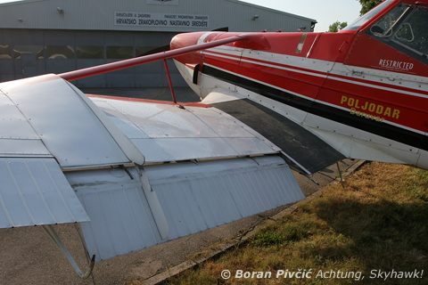 First up is a very interesting transient visitor, in town for some maintenance. When I saw it in my university's hangar undergoing some minor work, I must admit I briefly hoped that our air wing had diversified, but was disappointed soon afterwards :D. One of the preciously few Cessna 188s in Croatia, 9A-BKP - an A188B AgTruck - hails from Daruvar in the country's eastern agriculture-rich flatlandsMean and substantial, the 188 represents Cessna's only venture into the agricultural market (apart from an interesting crop-spraying 185 conversion). Lacking a unified type name, various 188 versions bore the AgWagon, AgPickup, AgHusky and AgTruck names, with the A188B AgTruck being the last and most powerful normally-aspirated modelDesigned to haul. Built in the 60s using extensive inputs from ag pilots and operators, the 188 embodies all the characteristics of a proper cropsprayer: a big, thick low speed wing, massive flaps, a high, crash-resistant cockpit - and every component made big and chunky, just in case 😀Interestingly, despite its substantial appearance, the 188 is quite light: only 980 kg empty when equipped with a dispersal systems. Even with a 1060 liter hopper tank aboard, the MTOW in the restricted category never climbs above 1800 kg (with 1450 being normal) - which, with 300 HP up front, probably makes for some spirited flying 😀More potent than the standard Piper Pawnee and more manageable than the Air Tractor, the 188 was a significant sales success with close to 4000 sold, but oddly enough few remain flying today (especially in Europe). With production having ended in 1983, they've been slowly phased out of their primary role, while their big, all-metal bulk and thirsty engine do not lend them well to secondary roles such as glider towing, where the simpler, cheaper Pawnee still enjoys a lot of successNext up is something much fairer and rarer: the Glaser-Dirks DG-200 single-seat glider :). Produced in only 190-ish examples, the 15-meter DG-200 is nevertheless a capable glider - with a glide ratio of 1/42 - equipped with both flaps and water ballast tanks. As is common on European gliders, its flight instruments are metric, which requires some quick mental calculation when dealing with ATC 🙂Assembly after transport - the most fun you can have short of actually flying :D. Of classic layout for single-seat higher-performing gliders, the DG-200 cockpit is clean and well laid out, covered by a practical one-piece canopy. Getting in though can be a bit of a palaver if your gymnastic skills are not up to scratch 😀More equipment means more handles :). Apart from the stick (and its wheel brake trigger) in the foreground, you have the yellow towrope release handle, the blue spoiler and the black flaps selector. Out of shot is the gear retraction handle, while on the opposite side are the water ballast tank valves and the emergency canopy release - and all without a bit of electricity 🙂And finally, an artsy view of our latest resident, 9A-JSA. Behind the unusual custom registration is a stock - but freshly repainted - 172N operated by a new company called JungSky and flown by a former member of our aeroclub and a current Fokker 100 captain 🙂
