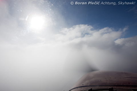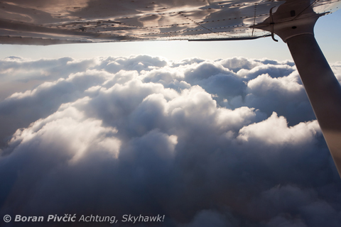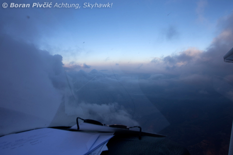 A view of the city of Zagreb from 7,000 ft, en-route from Varaždin (LDVA) in the north towards the coastal region of Kvarner. The aircraft (partially) in shot is a Socata TB-20, my first ever aircraft from this prolific French manufacturer :). And with that thin wing and panoramic windows, it is by far the best photography platform I’ve flown on 😀Crossing the Velebit mountains at their lowest point, above the region of Gorski Kotar. As in a number of photos previously featured on this blog, you can easily see why this mountain range has a penchant for creating problems during periods of strong wind :). Note also how, in terms of weather, it splits the continent (on the left) from the coast (on the right)A First Class view as we cruise leisurely above the Northern Adriatic, heading west :). Riddled with more than 1,200 islands along its length, the Croatian side of the Adriatic is at least easy to navigate down. Interestingly though, only four of those islands – Unije, Lošinj, Brač and Hvar – have airfields (two of which are small grass strips)This pretty much sums up why I love flying :). A sunset joyride above the coast, good company and the close and involved atmosphere of a light aircraft flight deck 🙂The evening mist is already beginning to settle as we race the sun back home to Varaždin. And despite it being the end of March when this was taken, you can still see traces of snow on the lee-side slopes below. Another interesting tidbit here is that this is the first time I’d managed to get both the wing and the horizontal stabilizer in a single frame 😀Back on the more… agricultural Skyhawk as we trundle from Zagreb (LDZA) towards Split (LDSP) at FL100. Flying IFR, we had to stick to published instrument airways, one of which had included an 18 NM hop over neighboring Bosnia, seen here to the left. In the center is the mountain of Plješevica at whose eastern base (again to the left) lies the now disused Željava airbase, one of the largest underground airbases in this part of EuropeNothing like a bit of cloudhopping to brighten up a day’s flying :). While it is all very good fun, it also has a few serious advantages: when flying in IFR in clear skies, every now and again when you turn your head you’ll – unintentionally – catch a glimpse of the ground below and gain a visual confirmation of your attitude… which isn’t really what IFR is about. Deep within a cloud though that visual cue is gone, and you’re left to your own instrument flying skillsAnother fantastic view of the Adriatic coast from 8,000 ft as we cruise back home to Zagreb via Zadar (LDZD) :). The mountains may be a welcome challenge to fly through, and the boring flat plains in the east of the country can do wonders for visual navigation skills… but nothing beats an afternoon flight above the sea :). For that short moment, you haven’t got a worry in the world!Back up at FL100 and finally above the clouds as the sun begins to set :). Flying in an area of increased humidity in sub-zero temperatures, we’d naturally picked up some frost along the way (visible on the lower windshield) – but the humidity content was not high enough for it to progress into “real icing”More cloudhopping as the night draws near. Despite not being a fan of single-engine night flying – especially above the uneven terrain in this part of Croatia – I’d timed the flight so that night would overtake us some 15 minutes out from Zagreb… just to log my first ever night IFR landing 😀I’ve been waiting for a long time to nail this photo :). Night had already arrived down at ground level, but nearly 3 km up, we still had some sunlight left 🙂