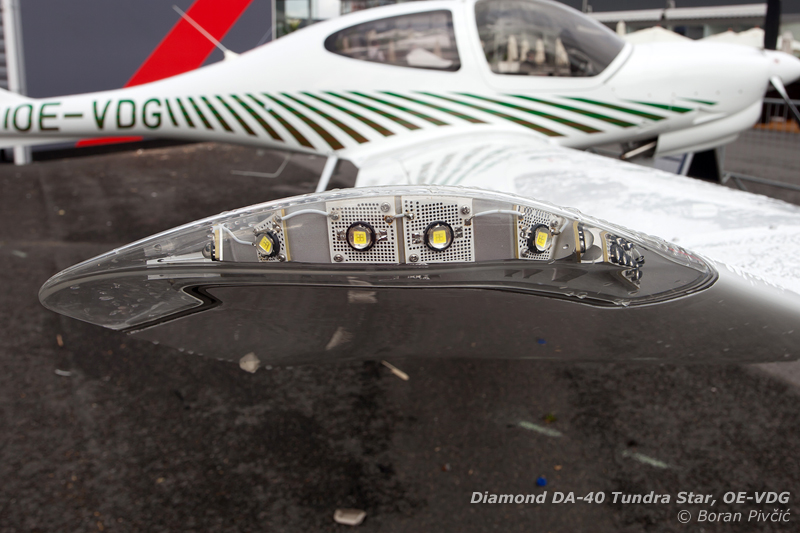 Like many modern light aircraft, the new-generation DA-40 has been fitted with LED nav and strobe lights, which significantly increase the aircraft's visibility in the air - but also, at the same time, noticeably reduce electrical consumption. This light cluster also includes the landing lights (visible to the right), which provide much better illumination than the old - and frequently temperamental - light bulbs 🙂