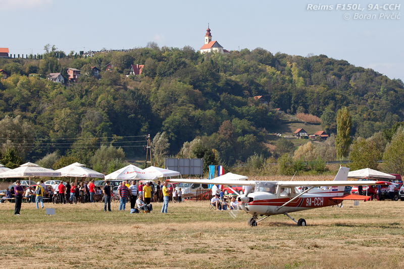 AK Zagreb's C150 lined up on RWY 18, posing for a perfect postcard shot with typical Zagorje scenery in the back - low cut grass, corn/maize fields, wooded rolling hills, the inevitable church (every town has one)... and, normally, gazebos with plenty of local wine :D.