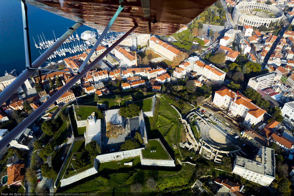 Winter is definitely not coming (despite it being December) as our little red Citabria zips past two of Pula, Croatia’s most notable landmarks: the Kaštel medieval Venetian fortress – and the Arena, one of the best-preserved amphitheaters in this part of Europe (even today the country’s most popular concert venue).