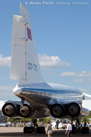 - a revised horizontal stabilizer with a pronounced dihedral to keep it clear of the engine exhaust, as well as a largervertical stabilizer to compensate for the increased yawing moment in an engine failure situation (with up to 5,180 HP instead of 2,820 now pushing hard on one side)