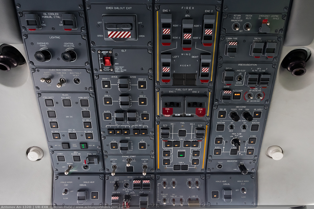 An overhead panel that was once hard to imagine in a Soviet aircraft. Like all modern layouts, this one also follows the so-called “dark cockpit” concept, in which normal system operation is indicated by the ABSENCE of any switchlight illumination. While this makes the cockpit duller from a photographer’s perspective, it reaps huge benefits in actual operations, since the crew can now quickly scan the panel for any issues without having to verify the status of each group of switches – if nothing is illuminated, you’re good to go!