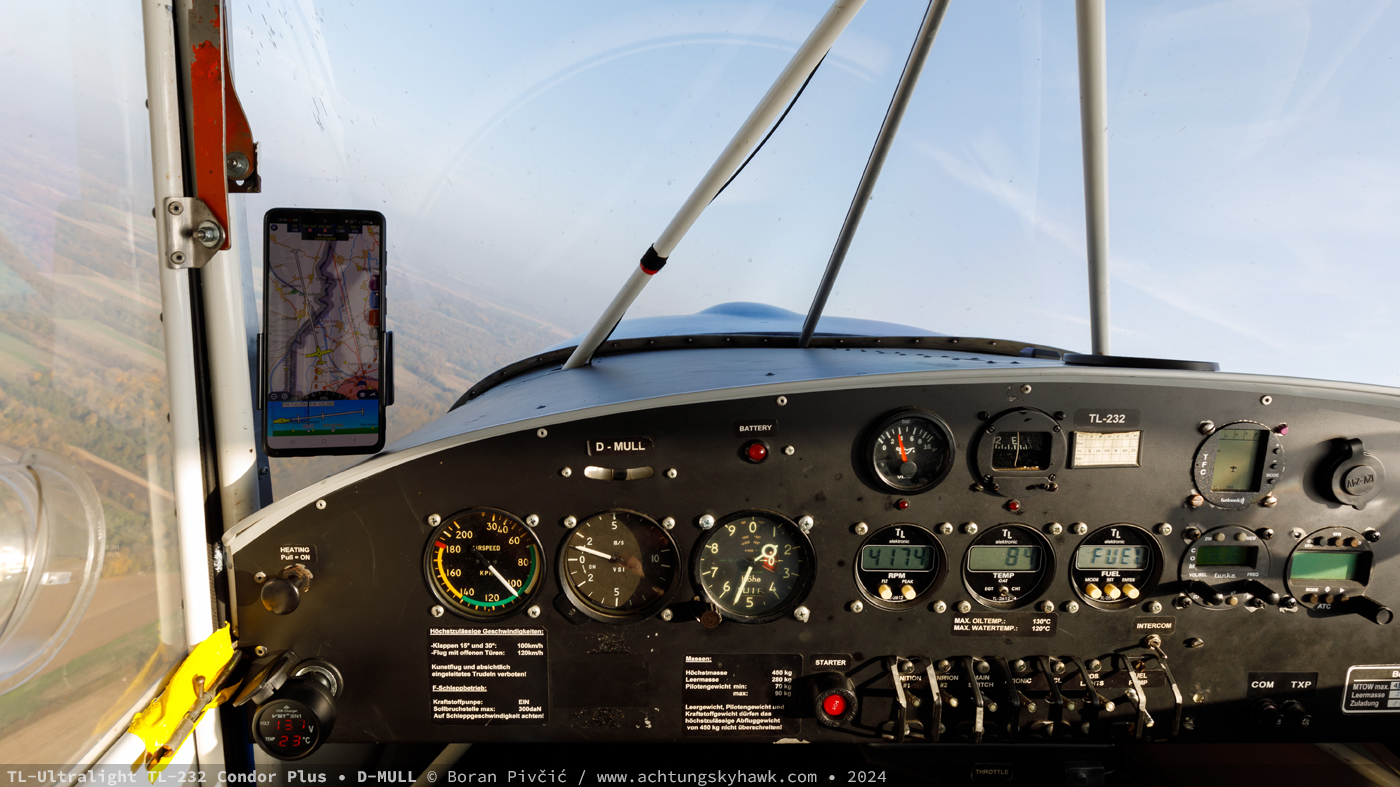 Fun is not a straight line… nor a particularly fast one, but I’m not complaining. One of the things that had immediately caught my eye was the airspeed indicator scale: goes all the way up to 180 km/h, but the yellow arc (above maneuvering speed/calm air only) starts at just a tad over 115. This, I suspect, may be due to the combination of a high lift wing and a lightweight main spar, making it rather easy to overstress with a full control deflection/any rapid increase in load at speeds higher than 120-ish km/h. Since it was a bumpy day with a lot of thermal turbulence – and I wasn’t really in a hurry to get anywhere – I decided to stick to conservative speeds and simply take in D-MRRP’s very elegant panel. A feature I particularly like is the tinted foil on the transparent roof panel, whose Visible Light Transmission (VLT) factor provided more than adequate ambient lighting (as seen here) without burning my scalp to a crisp