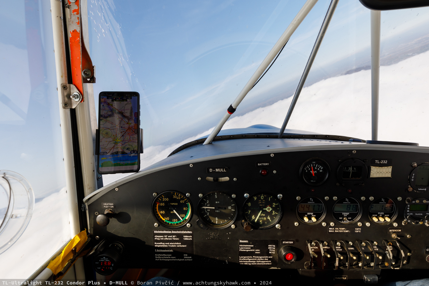 As can be seen from the photos, D-MRRP itself is a pretty standard FK9 Mk. II TG, manufactured in 1995 with the serial 09 050. Up front there’s a normie 912UL driving an equally unremarkable (though very efficient) three-blade Woodcomp Propuls 174 ground-adjustable prop. Historically too nothing much stands out, save for a forced landing due to an engine failure in 2016, which resulted in the collapse of the nose gear and damage to the propeller, requiring their replacement.