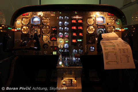 A slightly different view from "the jump seat". While not the most advanced or modern training device to see the light of day, the BT222 has all the ingredients required for the basic MCC course: dual instruments for both crew members, an autopilot to help reduce the workload - and numerous "failable" systems to keep you on your toes :). The approach charts you see clipped to the yokes are for Pula airport's (LDPL) VOR/DME approach for runway 27, which my teammate and I had just completed with flying colors (literally as you can see) 🙂