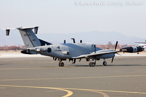 The apron itself did not disappoint either :D. All lumps, bumps and antennae, this purposeful looking RC-12K Guardrail is actually a SIGINT - or "signals intelligence" - aircraft, whose mission is to prowl the skies listening for new and unknown frequencies of hostile search and fire control radars and/or intercepting communication transmissions over a wide range of frequencies (hence the antennae). Quite secretive otherwise, this example belongs to the US Army, and is based on the not-at-all warlike Beech King Air A200 executive turboprop (or more precisely its military utility version, the C-12 Huron) - and was in town most probably to participate in a NATO exercise over the mountains of central Croatia. Interestingly enough, only nine K models were ever made, and this specific example is the first of the lot 🙂