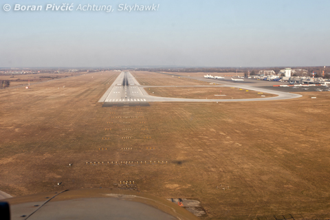 On final for RWY 05 after a pleasing afternoon aerial photography flight :). While not particularly impressive as an international gateway, Pleso has everything you really need for a smooth operations, including a CAT IIIb ILS and full runway and approach lighting (visible here are the last segment of the so called "Calvert approach lighting system"). The runway, 3252 by 45 meters, can accommodate anything up to and including the 747 and 777. The general aviation apron, easily recognizable by its darker pavement, is to the right of the photo