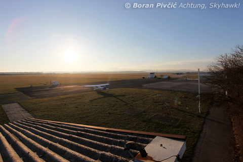 A strongly backlit overview of Čazma as it was back in February 2011. The runway - in pretty good shape it must be said - runs in a 01-19 direction, but its slope (sloping up RWY 19 by about 2 degrees) is not noticeable until you actually land...