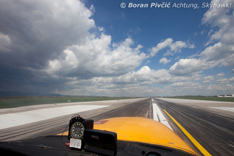 A world of contrasts as we start our takeoff roll down Zagreb's RWY 05, with another TCu incoming from the north. While it is usually seen just as the last stage of development before the fully-grown cumulonimbus, on occasion the towering cumulus cannot develop further and ends up as a medium-sized raincloud, characterized by moderately intense - but rather short - showers