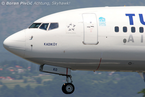 This shot made my day - and was worth the searing heat and scalding sun of a summer noon spent standing outside :D. Intense concentration in the cockpit of "Kadiköy", a Turkish Airlines Boeing 737-752, as it crosses the numbers on RWY 31 for a smooth and gentle landing