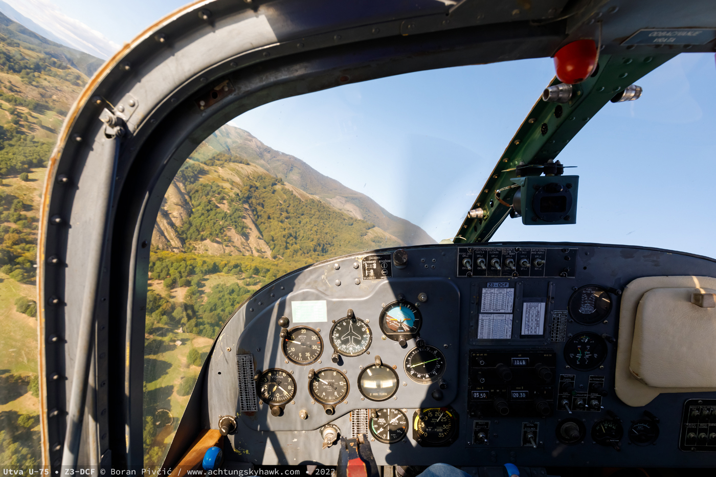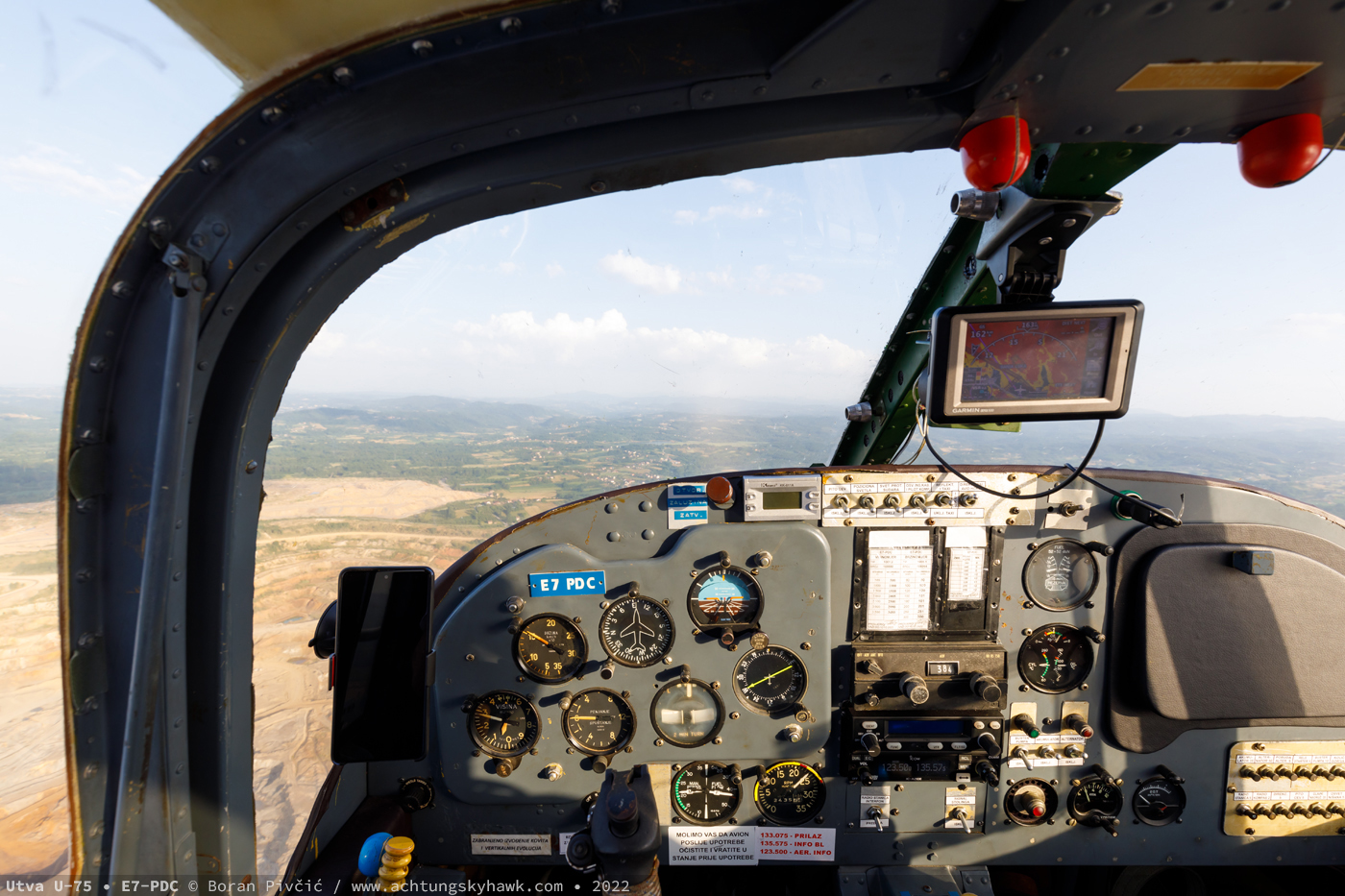 As iconic a cockpit view as there can be on the Balkans! True to its role as an everyday workhorse, E7-PDC has a few add-ons not normally found in other U-75s: a Garmin Aera 500 GPS unit, an ICOM IC-A210E com radio, and a Trig TT31 Mode S transponder (the King KR 85 ADF doesn’t count; that was part of the factory standard fit). Other new bits include more modern seats with modern harnesses, and outside there’s a full suite of LED navigation and strobe lights