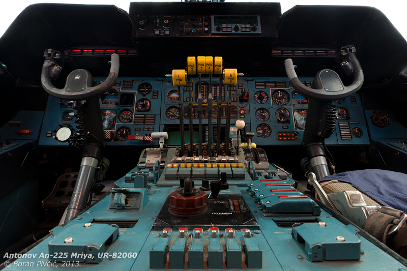 The awe-inducing mass of switches, dials and lights that forms the office of the two flight engineers. Even though many of the smaller An-124s – which share the same cockpit – have received some form of digital avionics upgrade over the years, the Mriya is still as (wonderfully) low-tech as it was when it first flew…